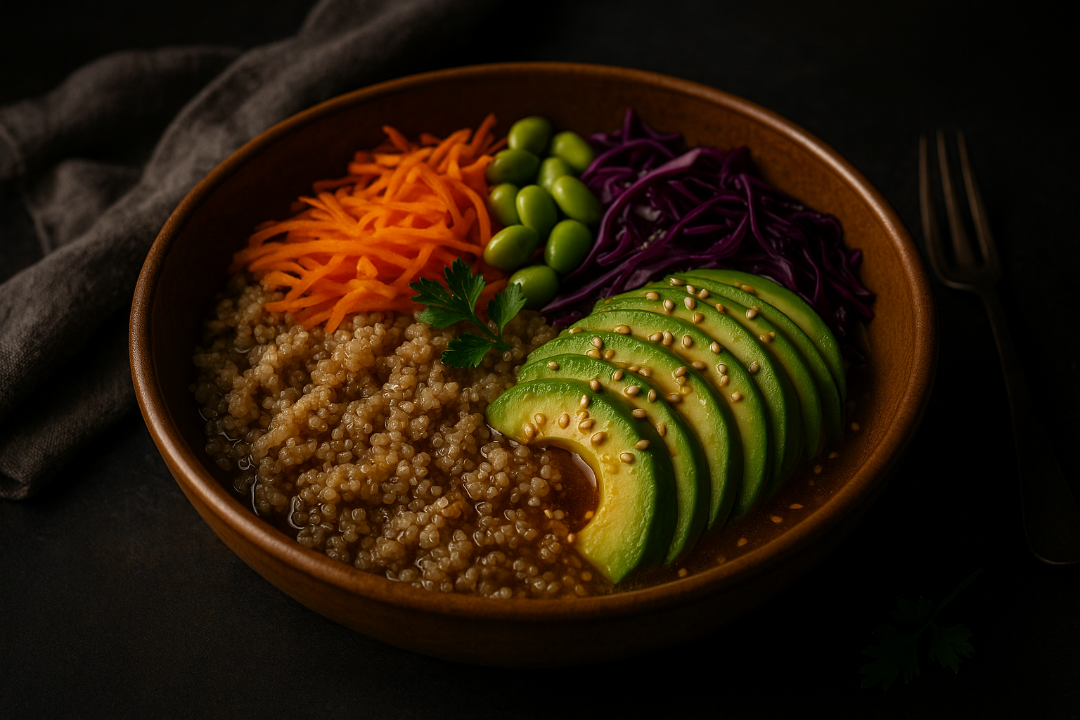 Un bowl nutritivo y colorido con quinoa esponjosa, aguacate cremoso, edamame, zanahoria rallada, col lombarda y un aderezo de sésamo y jengibre que lo une todo.